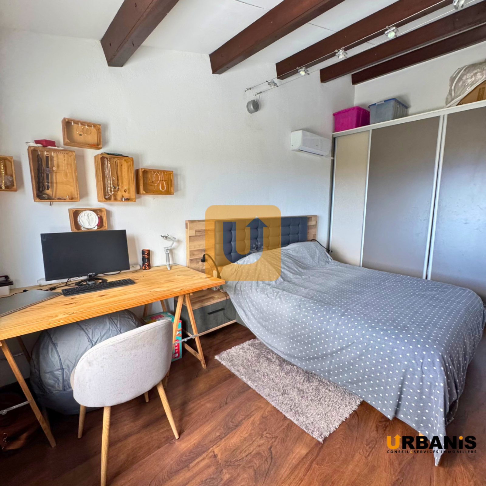 L’étage dispose d’une chambre également climatisée, bénéficiant d’une belle vue.